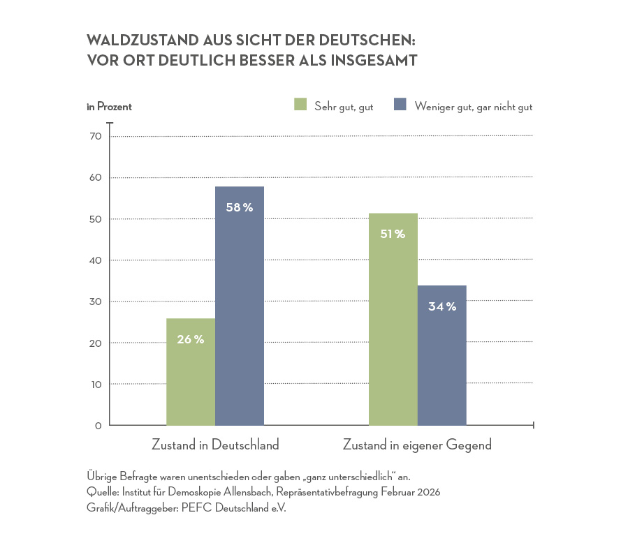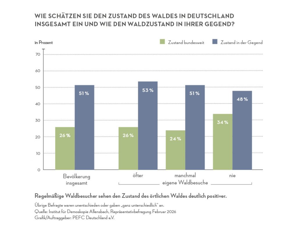 Zum Tag des Waldes am 21. März 2026 zeigen aktuelle Ergebnisse einer repräsentativen Bevölkerungsbefragung in Deutschland: Die Menschen blicken mit Sorge auf den allgemeinen Zustand der Wälder im Land – bewerten jedoch den Wald in ihrer unmittelbaren Umgebung deutlich besser. Die Studie wurde vom Institut für Demoskopie Allensbach im Auftrag von PEFC Deutschland im Februar 2026 durchgeführt. Befragt wurden 1.052 Personen ab 16 Jahren.